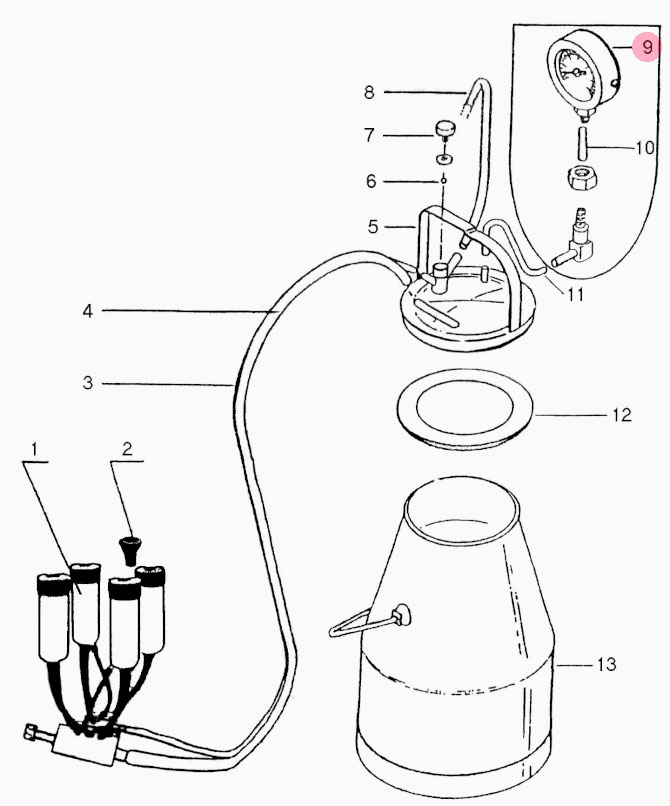 1 - Доильная аппаратура, 2 - Ложный сосок, 3 - Вакуумный шланг, 4 - Молочный шланг, 5 - Крышка бидона, 6 - Стальной шарик клапана Ø11, 7 - Уплотнительное кольцо, 8 - Пластмассовый винт ограничитель, 9 - Вакуумметр, 10 - Шланговое соединение вакуумметра, 11 - Патрубок вакуумметра, 12 - Прокладка крышки бидона для молока, 13 - Бидон для молока 22,6 л.